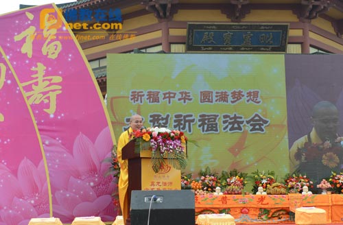 升座仪式结束后,在南山华严世界广场举行了以“祈福中华、圆满梦想”的大型祈福法会。南山寺新任方丈真龙法师在法会上致欢迎词。他首先代表南山寺两序大众对前来参加庆典的海内外高僧大德,各级领导和众位居士们表示热烈的欢迎和衷心的感谢!
