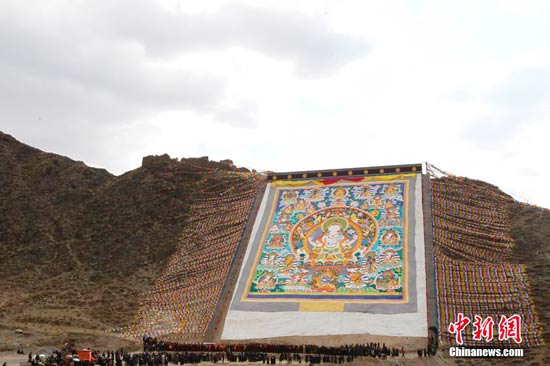 2014年4月14日,青海省玉树县结古镇当卡寺举行晒佛大会,缅怀4年前在地震中遇难的2000多名民众,并为生者祈福。