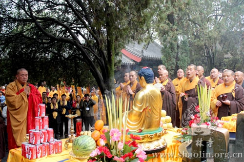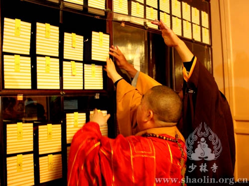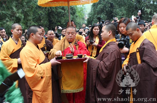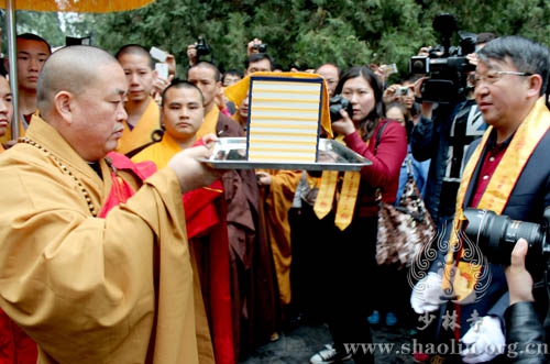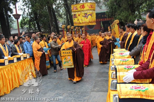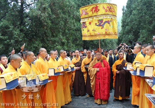 迎奉《清敕修大藏经》活动在隆重的佛教仪式中有条不紊地进行,如法如律。在少林寺山门前,永信法师拈香后,从何唯良先生手中接过《清敕修大藏经》经书,安放于经桌之上。随后,迎请经书的队伍在永信法师的率领下,抵达少林寺方丈室前。在阵阵清澈空灵的梵呗声中,永信法师拈香主法,并为经书安放举行洒净仪式。