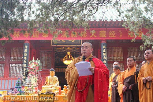 在洒净仪式结束之后,永信法师向大家讲解了少林寺迎奉《清敕修大藏经》的意义,他讲到,《清敕修大藏经》为清代官刻《大藏经》,是中国官刻佛教大藏经的最后一部,“法宝是佛教三宝之一。大藏经代表着佛教的全部智慧,总集佛一切法身慧命,法宝供养乃成为佛教三宝供养的重要组成部分。历史上,从宋代《开宝藏》以下,历朝刊刻佛教大藏经成为中国佛教的传统。”永信法师还讲到,少林寺是最早创建藏经阁的寺院之一,少林寺藏经阁现有图书50000余种,300000余册,包含北齐至明清时期拓片近万件。目前,少林寺藏经阁馆藏古籍三万多册,其中善本近6000种、20000余册。2013年4月,经国务院批准文化部确定,少林寺入选第四批全国古籍重点保护单位,标志着少林寺以藏经阁为载体的古籍保护进入到一个新的阶段。