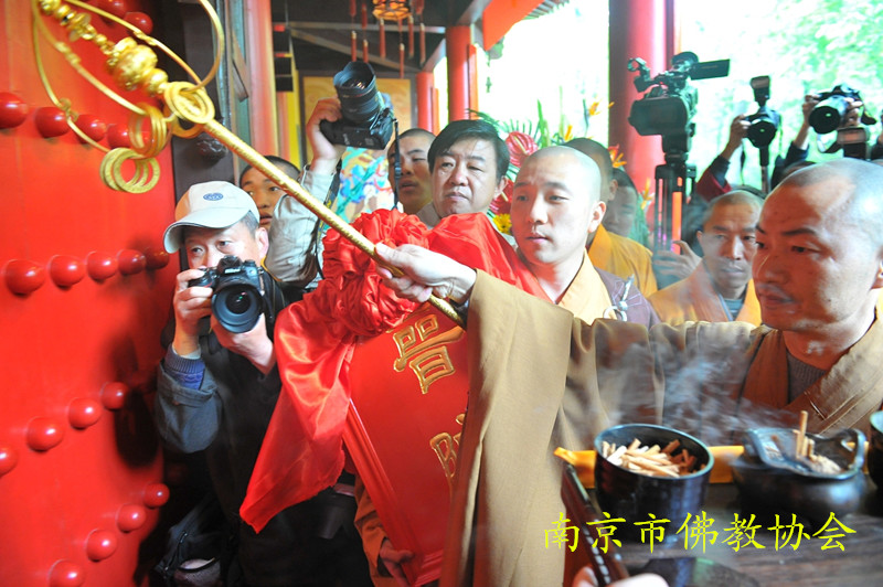 上午8时,庆典法会正式开始!传静法师在灵谷寺正山门振锡说法,并依次至天王殿弥勒菩萨与韦驮菩萨座前,拈香说法,展具礼拜。