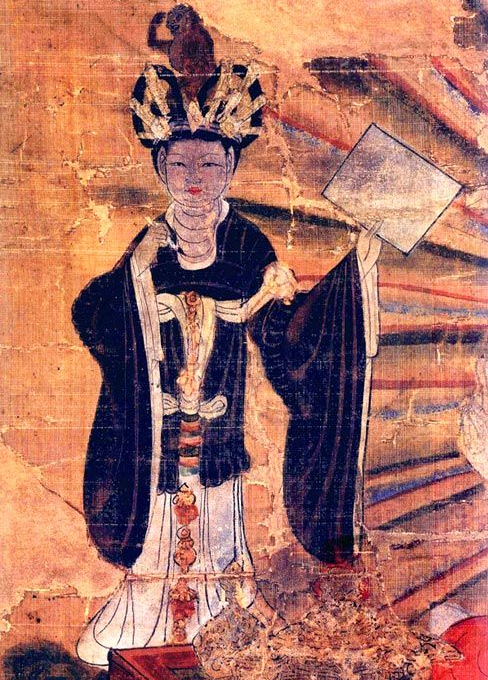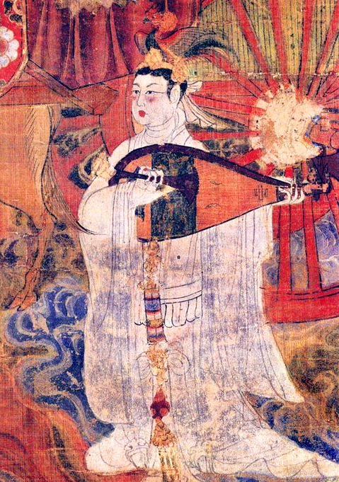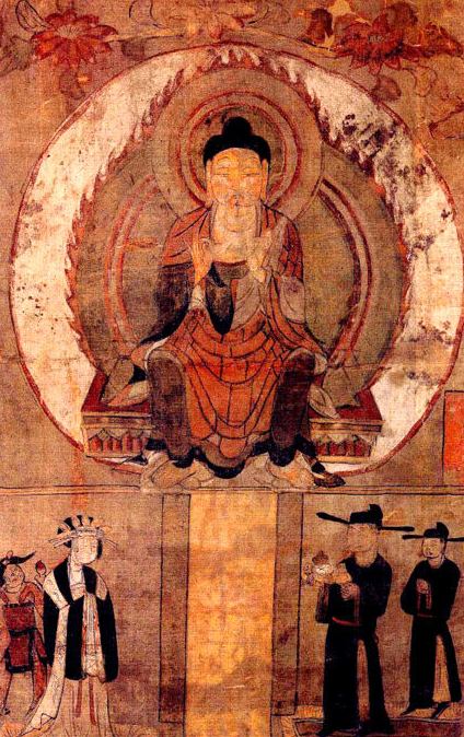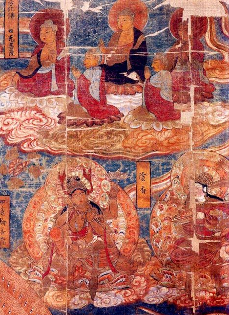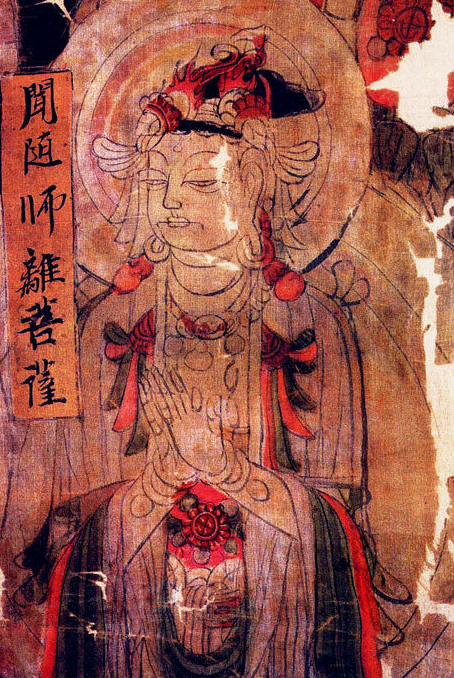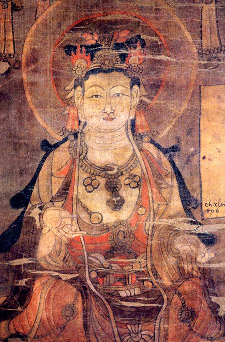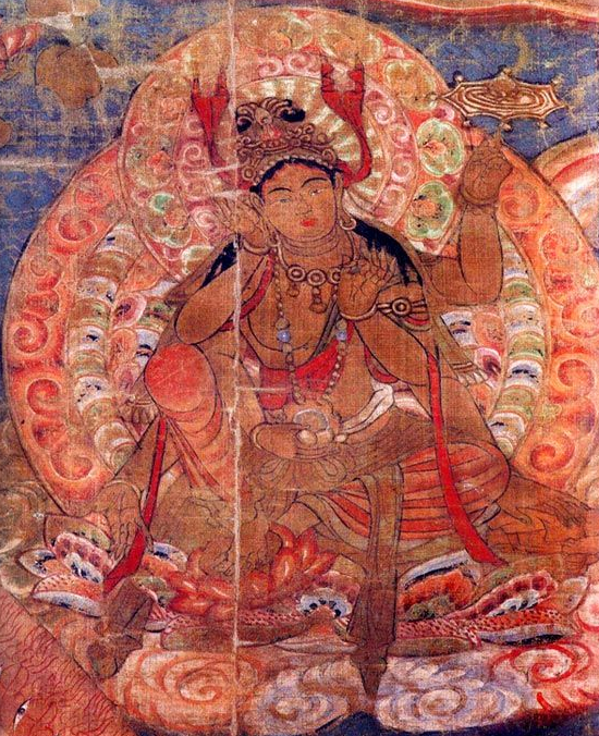 图为阿弥陀八大菩萨图局部,唐吐蕃时期(9世纪初),绢本设色