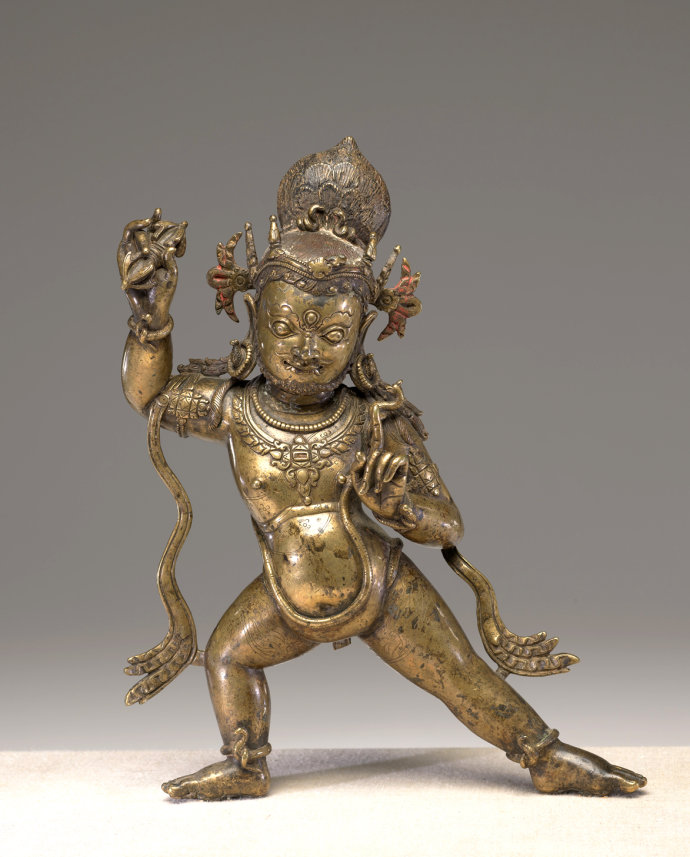 金刚手头戴骷髅冠,火焰状的赤飘扬于头顶,形成桃状。面部三目圆睁,须眉如火,獠牙露齿卷舌,长口露齿,左手于胸前结期克印,右手高执金刚杵,左展姿站立。躯体粗壮,肌肉饱满,张开的开腿,宛如象腿,粗壮有力,稳如泰山。装饰繁缛。项链、璎珞、钏环、人头鬘及骨饰与蛇饰为庄严。虎皮裙雕刻细致入微。身上挂着一条长蛇,在身前形成U形。此尊金刚手造像面部比较柔和,做工精细,保存完好,是难得一见的西藏十三世纪造像精品。