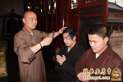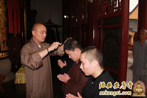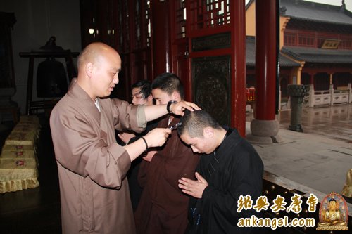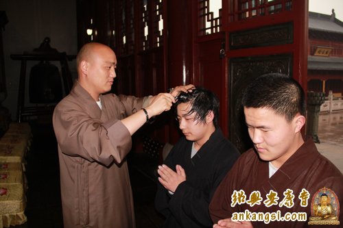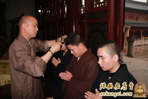 2014年4月12日下午,浙江绍兴安康寺方丈上法下弘大和尚为安康寺寺发心出家的三位善男子剃发出家!