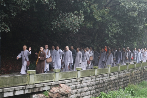 3月30日上午7:10,杭州佛学院师生与中天竺法净寺常住以及护法居士100多人从中天竺法净禅寺步行至云栖竹径莲池大师墓前祭祖。