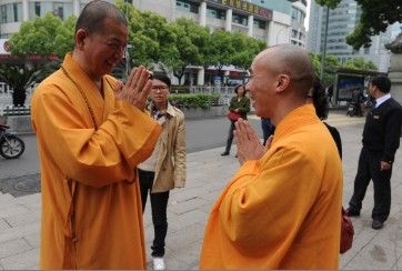 上午11时左右,参访团乘坐的大巴抵达寺院山门口,界义法师率众执事在门外迎候。在界义法师等的陪同下,明光大和尚一行先到圆通宝殿与常住四众会面。欢迎仪式上,两序齐唱“香赞”、大众集体礼佛后,监院定光法师首先致辞,欢迎明光大和尚一行到七塔禅寺参访,希望大家此行能有满意的参学收获。随后,明光大和尚为大众开示,对七塔禅寺常住四众的热情接待表示感谢!称此次大陆之行,是依循前世界佛教僧伽总会会长、台湾“中国佛教会”理事长悟明长老(1911—2011)的出生、出家、受戒、参学、弘法度生的足迹来寻根溯源,以此缅怀悟公之恩德!老和尚生前曾交待弟子,七塔禅寺是观音道场,号称“小普陀”,是朝拜普陀山的必到之地。因此,明光大和尚此前就曾来此参访过,此次又特意率团再来,感觉因缘非常殊胜!