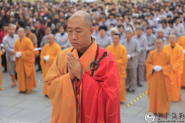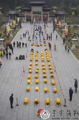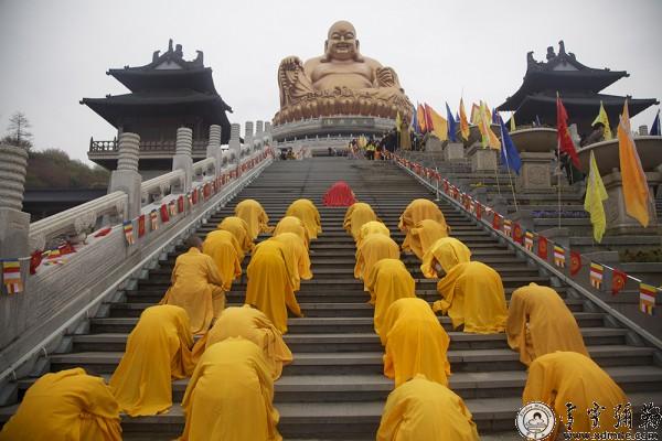 而后,怡藏大和尚带领两序大众及广大参与者开始朝弥勒大佛进行三步一拜。一时间,伴随着“南无弥勒尊佛”,浩浩荡荡的善信队伍向着弥勒大佛出发,井然有序的朝着大佛礼拜,或许此刻他们少了些许的忧愁与烦恼,多了一份诚心与善信。