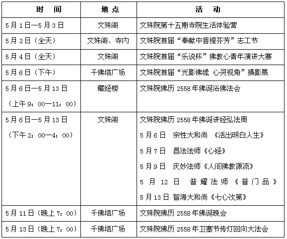 为了给广大信众、佛法爱好者及游客朋友们提供一个体验寺院生活、感受佛教文化、过佛教节日的机会,成都文殊院将举办“五月弘法月”大型主题弘法活动,盛邀大众汇聚文殊院,过一个难忘的“弘五月”。