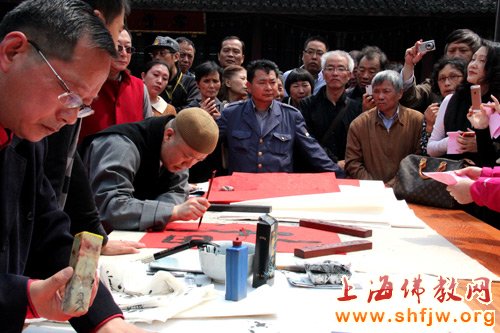 龙华古寺方丈照诚大和尚善心涌动,于龙华古寺大雄宝殿前设书画摊,现场书法,为甘肃生命之源“甘露工程”人饮水窖工程募款。