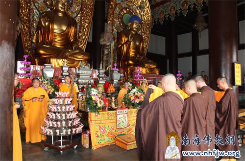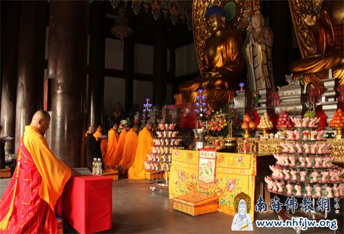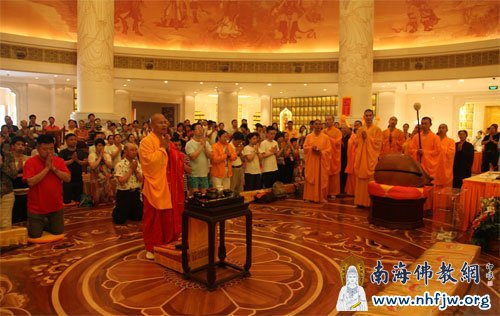 上午8:30,由南山寺首座智法师主法,率领全体僧众及各方护法居士于金堂虔诚礼拜《慈悲三昧水忏》,祈求仗佛慈力,悯念轮回受苦众生,超越恶道,得生净土。僧众各自忏悔发愿,早日脱离六道,圆满菩提,并祈福风调雨顺,国泰民安,政通人和,物阜民康。