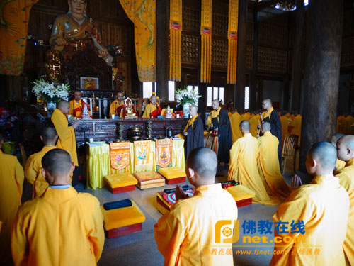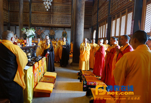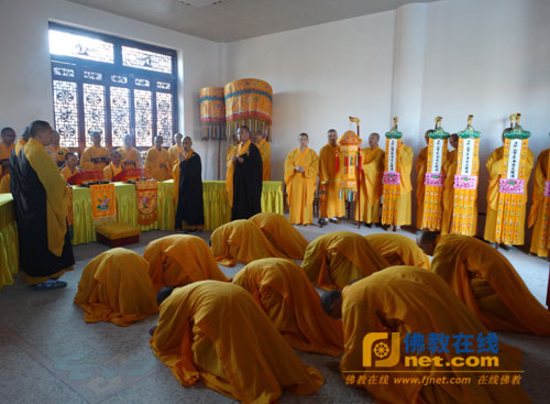 钟鼓齐鸣,新戒展大具;至诚顶礼和尚三拜,撩衣、起具、问讯。分班而立,礼送三师。