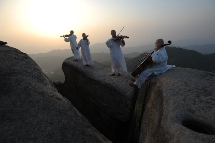 僧人们在天台山试心石上演奏卡农