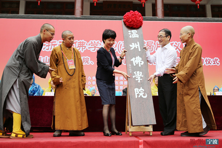 浙江省委统战部副部长、省民宗委主任冯志礼与温州市政府副市长郑朝阳为温州佛学院授牌(图:陈春 凤凰宁波)