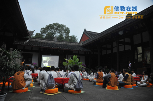 在禅堂小院里观看佛教纪录片,体会生老病死