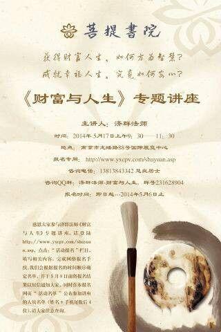 感恩大家参与济群法师《财富与人生》专题公益讲座,请登陆http://www.yxcpv.com/shuyuan.asp,点击:“活动报名”栏目,填写相关内容,完成网络报名手续。我们会根据报名的时间顺序确定名单,并于5月8日前将报名结果以短信通知大家,同时在本报名网页“活动名单”公布参加讲座的人员名单(姓名+手机尾数后4位),请大家注意查询。