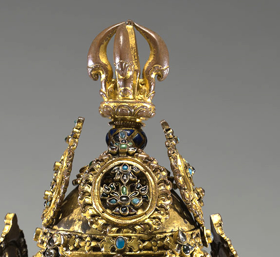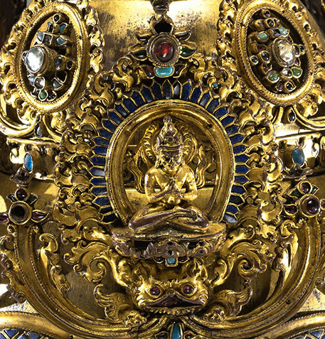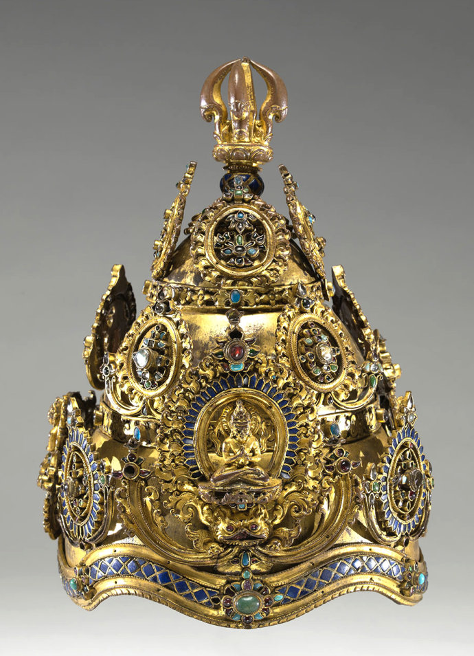 这件异常精美的三层五佛冠,出自十二世纪的尼泊尔地区。五佛冠又作五智冠、五智宝冠、五宝天冠、灌顶宝冠等,是密宗金刚上师修法时,戴著像徵五智如来的宝冠。宝冠上饰有五方佛像和符号。主尊大日如来安住中央位置,东南西北四方各有一镶嵌宝石所形成的圆形图案,用以表示五智圆满之德。五佛冠最顶端为金刚杵严顶,宝冠镶嵌有珍珠、绿松石、蓝宝石等各种珠宝,极其精美华丽,高贵庄严。