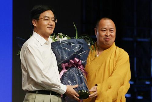 印顺大和尚与深圳市委宣传部副部长李瑞琦共同接受献花