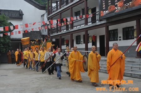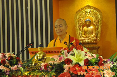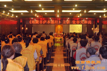 2014年5月16日上午,湖南佛教首届讲经弘法月开始宣讲第二部经,礼请安徽省佛教协会副会长、安庆市佛教协会会长、九华山佛学院副院长、潜山天柱山三祖寺方丈宽容法师宣讲《地藏菩萨本愿经》。
