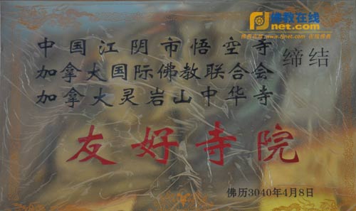 江苏无锡悟空寺和加拿大灵岩山中华寺缔结为友好寺院
