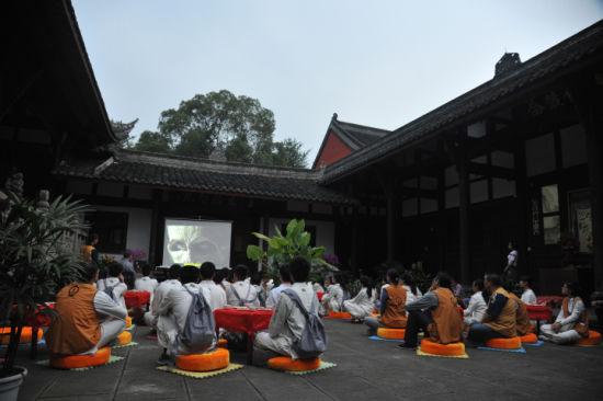 在禅堂小院里观看佛教纪录片,体会生老病死
