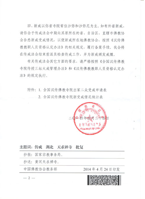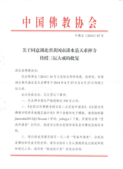 经中国佛教协会批准,由湖北省佛协主办,黄冈浠水县天求禅寺承办的传授三坛大戒法会将于2014年8月27日至9月27日举行。详情如下: