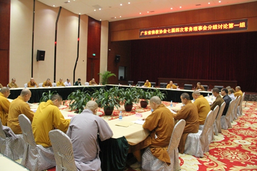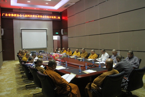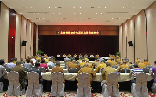 2014年5月20日上午,广东省佛教协会七届四次常务理事会在广州华泰宾馆召开。省佛教协会常务理事应到会94人,实到会71人,23人因事因病请假。省民族宗教委副主任曾晓晖、省委统战部处长柯维良、省民族宗教委宗教工作一处处长符永培出席会议。