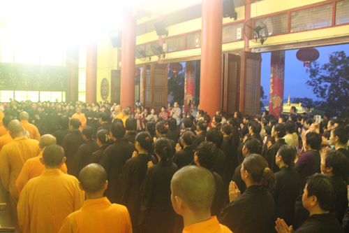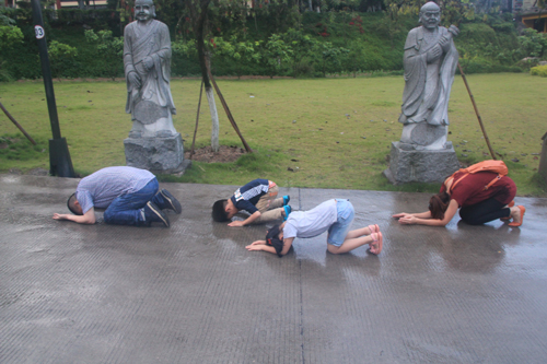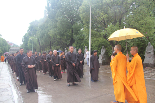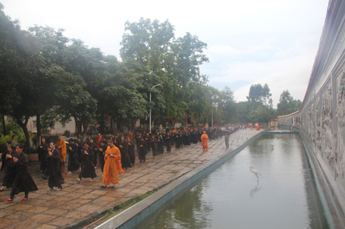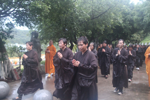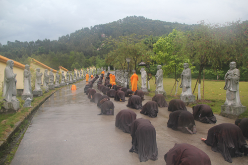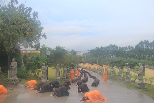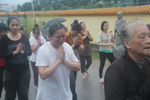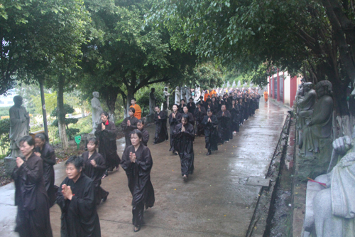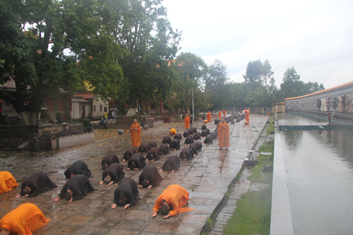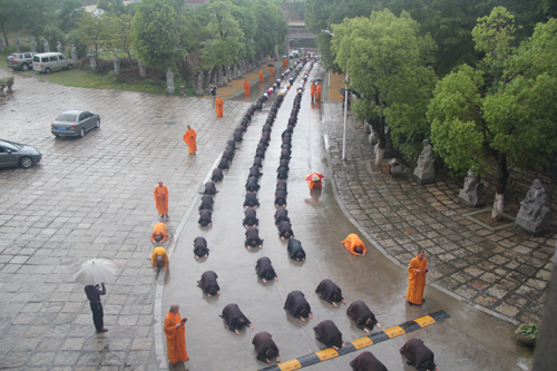 父恩如山、母恩如海,父母恩情大须弥,朝礼药师报诸恩。2014年5月11日晚18日时,时逢母亲节,300多位护法善信,穿著海青,在倾盆大雨中庄严地排著队伍,从石室禅院的广严化城门前启程,三步一跪地朝拜位于大雄宝殿的药师佛。