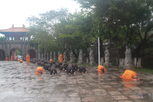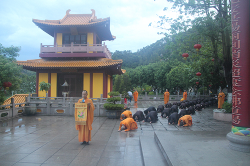 石室禅院住持忠明法师在朝山开始前,也为大众勉励雨中朝拜的殊胜,并开示朝山功德利益。忠明法师领众在雨中诚念“朝山祈愿文”,然后三步一拜地向药师佛迈进。虽然天空下着倾盆大雨,大众如同沐浴在药师佛洒下的甘露之中,而是倍感法喜。大众脸上夹杂著汗水与感动的泪水及甘露,早已分不清彼此,随著脚步的迈开,内心的烦恼也一点一滴的洗净、涤除。队伍中,不乏五岁的幼儿及年过八旬的老菩萨。却仍坚持信念,虔诚地念佛礼拜。幼儿虽未明理,但以虔诚之心朝礼药师佛,难免不令人感动。