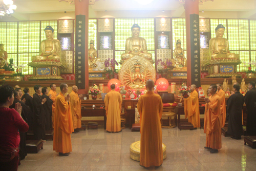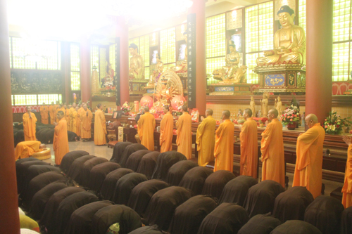 三步一拜的祈福活动行进约1个半小时后,在大雄宝殿内,忠明法师领众进行祈愿回向仪式,大众共同诚挚祈愿药师如来殊胜加持,普天下的父母得安康,个人现世父母福寿安康,往生者离苦得乐、早生净土!