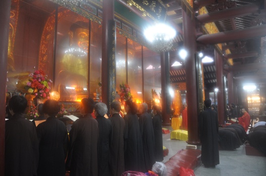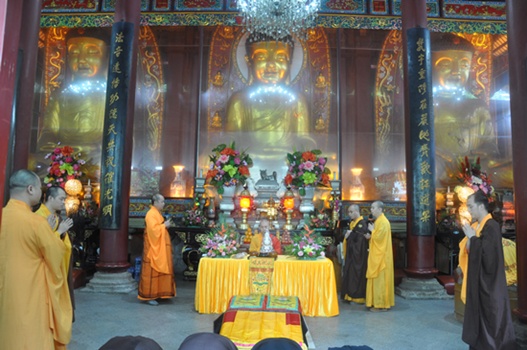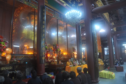 全体法师带领居士、信众在大雄宝殿内齐诵经