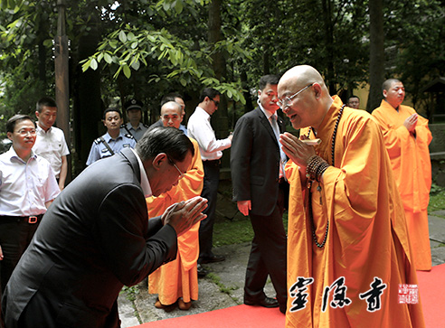 灵隐寺方丈光泉法师在山门迎接柬埔寨洪森首相