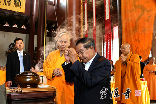 在光泉法师的陪同下,洪森首相参观了灵隐寺主要殿堂,在大雄宝殿拈香礼拜释迦牟尼佛,在药师殿看望了正在共修华严的我寺两序大众。