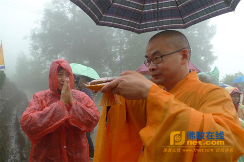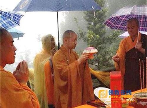 纪念法会当天,天国寺华雨弥天,普降甘霖。来自各地寺院的诸山大德以及诸多信众,冒着大雨,在宽霖老和尚灵塔前举行了隆重的纪念仪式,宗性法师带领大众以虔诚心在老和尚灵塔前礼拜上供,感怀纪念老和尚的丰功伟绩。