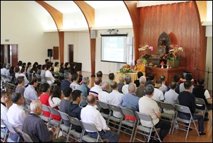 法鼓山方丈果东法师于美西时间2014年5月25日上午10时,前往洛杉矶道场关怀当地信众,并进行“抱愿不抱怨”演讲,受到信众热情的迎接。现场有25位尚未皈依三宝的学佛民众,也把握此次难得的因缘,礼请果东法师在演讲前为他们正授三皈五戒,为生活营造和乐无诤的幸福契机。