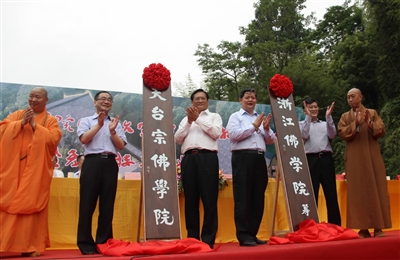 王健、冯志礼和市委副书记、市长张兵,县委书记李志坚,怡藏法师、允观法师等共同为天台宗佛学院揭牌。张兵宣布天台宗佛学院教学楼开工奠基。