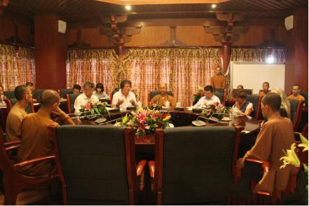 2014年5月25日上午,来龙泉寺参访的荷兰大悲禅院智友禅师(Professor Ton Lathouwers)和光明禅师(Professor André van der Braak)与中国人民大学哲学院副院长、国际佛学研究中心主任魏德东教授在明心阁举行座谈会。