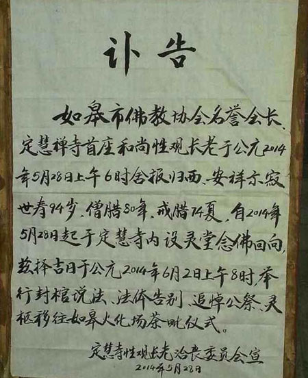 江苏省如皋市佛教协会名誉会长、定慧禅寺首座性观长老于2014年5月28日上午6时在定慧禅寺内舍报归西,安祥示寂,世寿94岁,僧腊80年,戒腊74夏。