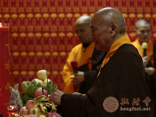 上午七点半华严法会正式开始。受印顺大和尚的委托,弘法寺首座一如长老代表僧俗二众拈香祈福。“炉香乍热,法界蒙薰,诸佛海会悉遥闻,随处结祥云,诚意方殷,诸佛现全身……”经堂内妙香遍布,梵呗缭绕,大众分站东西两单整齐排班,以无比恭敬之心,祈请三宝加持,共入华藏净土。祈愿世界和平,国泰民安,风调雨顺。
