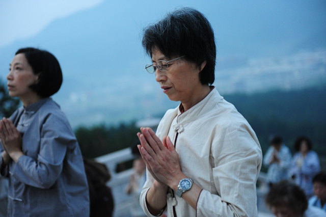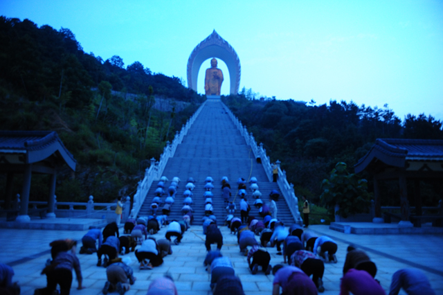 2014年6月6日,清晨4点,天还未亮,来自杭州的175位居士,列队整齐,念着弥陀圣号,踏着露珠,行进在信愿路上。他们从拜佛台起香,三步一拜,虔诚、恭敬的礼拜阿弥陀佛,至大佛台后,在阿弥陀佛像前,回向发愿。圆满了期待已久的朝礼大佛的心愿。