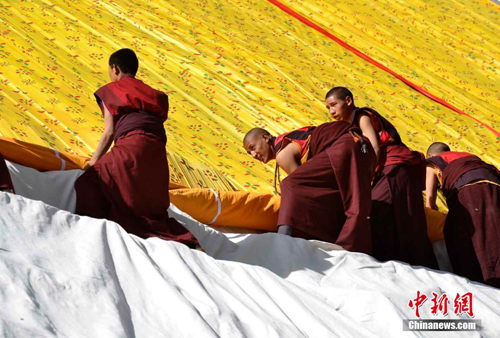 楚布寺僧人在展佛台上展开巨幅唐卡