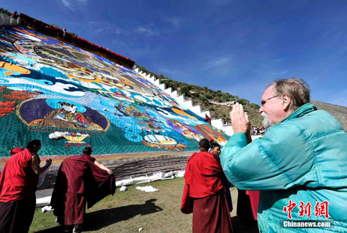 外国信众朝拜巨幅唐卡