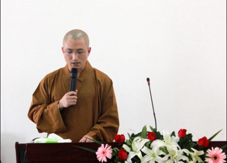 2014年6月3日上午,重庆佛学院在四楼多媒体教室举行“诚外无物”2014年重庆佛学院片区讲经初赛。重庆市民宗委宗教三处调研员史金山、大渡口区民宗办主任尹瑜、佛学院办公室负责人叶芸、佛学院教育处处长佛照法师、2013级男众本科班班主任妙祥法师、佛学院证性法师、2013级女众本科班班主任了续法师担任此次讲经比赛评委,学院2013级男众本科班学僧定文法师担任主持,重庆佛学院全体师僧共50余人出席了活动。