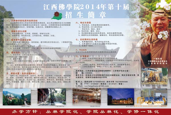 江西佛学院2014年第十届招生工作启动,报名时间自从即日起至2014年9月5日。招生简章如下: