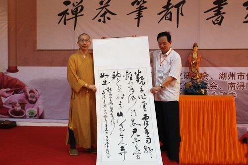 开幕式结束后,举行了禅茶文化演艺,由法师进行禅茶表演,茶界茶艺表演以及各地书画家进行现场创作书画。并由著名诗人吟诵禅茶诗词。湖州陆羽茶文化研究会向湖州市佛教协会、湖州永欣寺赠送书画作品,惟学法师代表接受赠送并表示感谢!