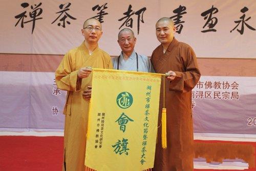 最后,湖州市佛教协会会长法心大和尚宣布下一届湖州市禅茶文化节暨禅茶大会承办单位,由湖州市佛教协会副会长、长兴寿圣寺方丈界隆大和尚接受,并交接会旗!