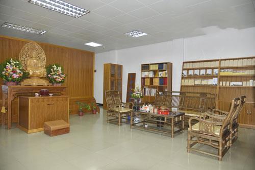 南普陀寺在布置佛法辅导室时煞费苦心,反复的比较与斟酌,为的就是能够营造出清净庄严的佛教氛围,令来访者一进入辅导室时就立刻感受到来自三宝的气息,来自南普陀寺清净庄严的道场印象。辅导室正中供奉着清净庄严的药师琉璃光如来佛像,一进门就能感受到来自佛陀慈悲目光的注视,当下就能够清净来访者的身心。案台、窗帘、茶几、沙发、书架等都采用了自然原木色,使人感觉温和平静与自然亲切。佛前供养着缤纷的香花与净明的酥油灯,还有周边点缀上的若干盆绿色植物,怡人悦目,充满生机。香樟木沙发的摆放也极有讲究,采用u形的包围,不会直接面对面使目光直视造成心理压力。在佛像背后还有一处屏风作为隔断,此处相对的隐秘,当来访者有比较私密的问题时,在这隐秘的空间里,可以让来咨询的人能够放下顾忌、畅谈交流。辅导室选址位置也是有其考虑,面朝着大悲殿既能方便来访者寻找,但背靠着山体又保持着一定的隐秘性。
