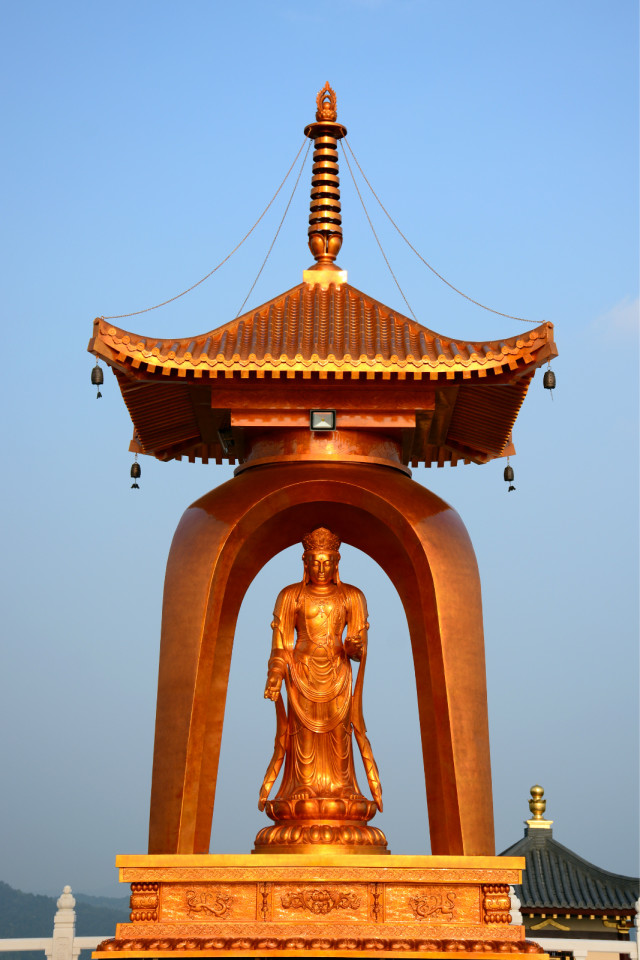 阿弥陀佛与观世音菩萨、大势至菩萨合称“西方三圣”。观世音菩萨,是阿弥陀佛的左胁侍者;大势至菩萨,是阿弥陀佛的右胁侍者。二大菩萨辅助阿弥陀佛,劝导众生信愿念佛求生净土。