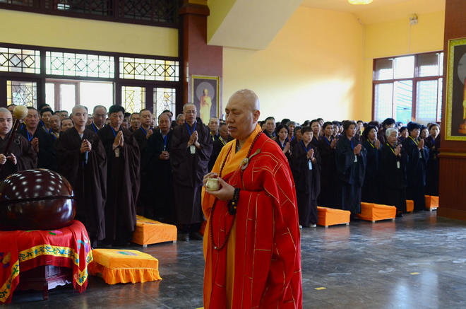 下午2时30分至3时30分,灵德法师为与会法众“讲规矩”。法师开示说,菩萨戒精神是发起上求下化的菩提心,自利利他,度化众生出离生死苦海,故而戒子们当严格要求自己,深信因果,断恶修善,慈爱宽容。在寺院里,居士们当穿着得体,随顺大众,尊重三宝并依教奉行。