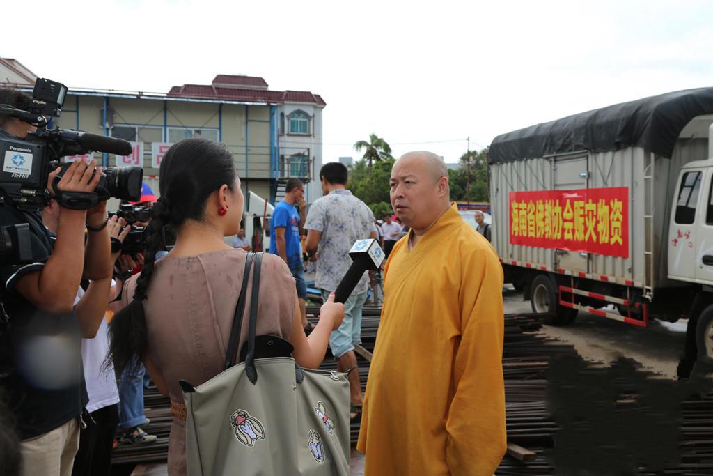 最后,在诸位领导与嘉宾的见证下进行了援助灾区捐赠仪式。海南省佛教协会向文昌市捐赠大米100000斤,饼干300箱,食用油408瓶,方便面3120桶,家庭蛋面80包,矿泉水4800瓶,彩条布2000平方,卷纸50条,婴儿纸尿裤3箱,卫生用品4箱等物资,深圳弘法寺慈善功德基金会捐赠15万元慰问金。仪式结束后,印顺大和尚接受了海南省广播电视总台的采访。