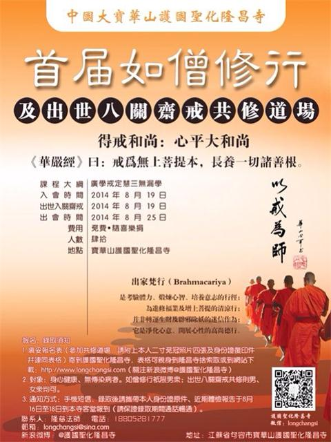 隆昌寺将举办首届《如僧修行》及八关斋戒法会